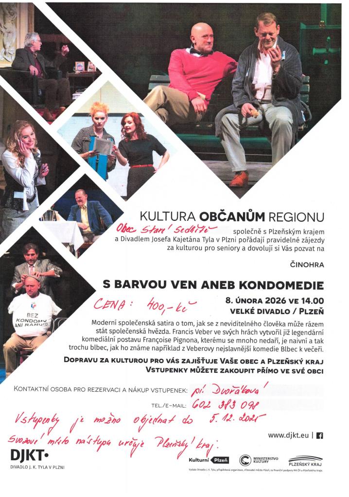 Plzeňský kraj pořádá zájezd na činohru S barvou ven aneb kondomedie do Divadla Josefa Kajetána Tyla v Plzni dne 8. února 2026 od 14:00 hod. Svozové místo našim občanům určuje Plzeňský kraj.