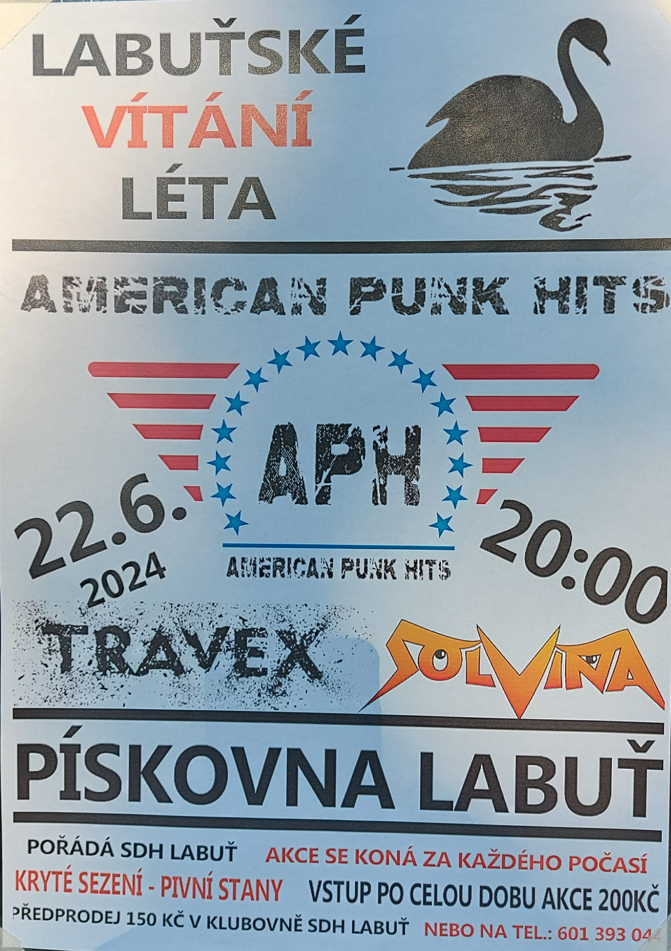 SDH Labuť pořádá "Labuťské vítání léta" 22. 6. 2024 od 20:00 hodin v labuťské pískovně. Vstupné v předprodeji 150 Kč, na místě po celou dobu akce 200 Kč.