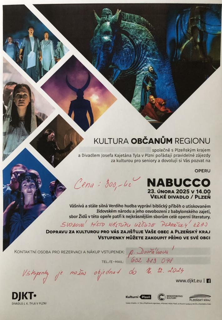 Plzeňský kraj pořádá zájezd na operu NABUCCO do Divadla Josefa Kajetána Tyla v Plzni dne 23.února 2025 od 14:00 hod. Svozové místo našim občanům určuje Plzeňský kraj.