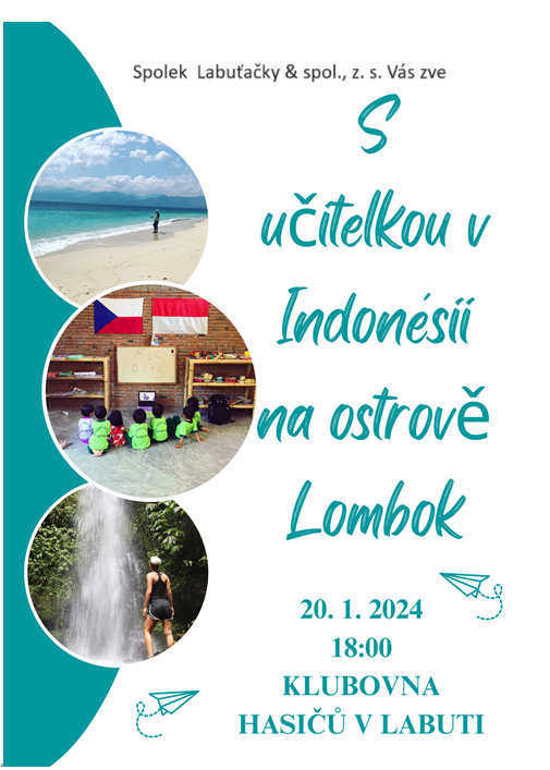 Pozvánka do Labutě. Spolek Labuťačky a spol., z.s. Vás zve "S učitelkou v Indonésii na ostrově Lomkok". Sobota 20. 1. 2024 od 18.00 hodin v klubovně hasičů v Labuti.