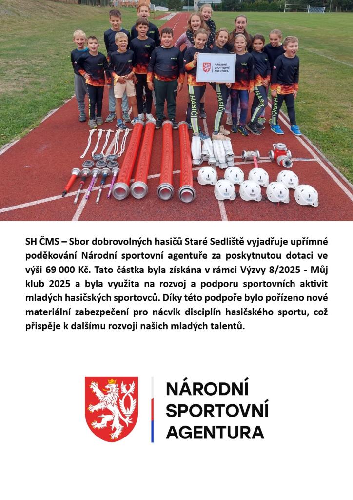SH ČMS - Sbor dobrovolných hasičů Staré Sedliště vyjadřuje upřímné poděkování Národní sportovní agentuře za poskytnutou dotaci ve výši 69 000 Kč. Tato částka byla získána v rámci Výzvy 8/2025 - Můj klub 2025 a byla využita na rozvoj a podporu sportovních aktivit mladých hasičských sportovců. Díky této podpoře bylo pořízeno nové materiální zabezpečení pro nácvik disciplín hasičského sportu, což přispěje k dalšímu rozvoji našich mladých talentů.