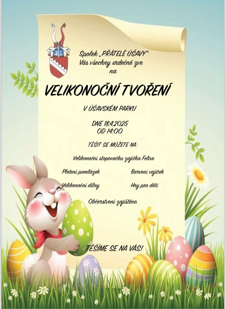 Spolek Přátelé Úšavy, z.s. Vás všechny srdečně zve na "Velikonoční tvoření" v úšavském parku, které se koná 18. 4. 2025 od 14.00 hodin.