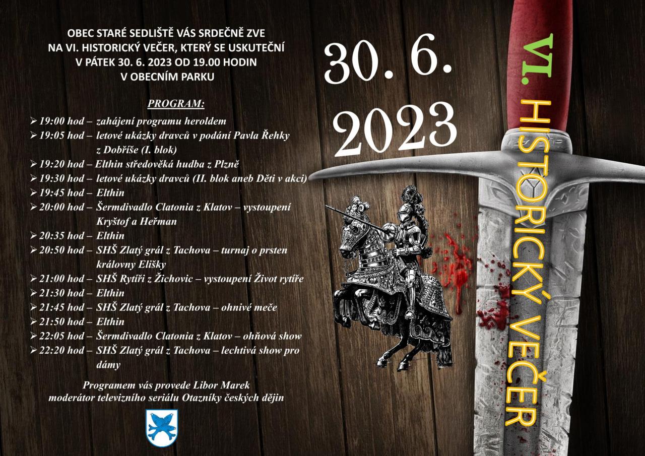 Obec Staré Sedliště Vás srdečně zve na VI. Historický večer, který se uskuteční v pátek 30. 6. 2023 od 19.00 hodin v obecním parku. Bohatým programem vás provede herold Libor Marek, moderátor televizního seriálu Otazníky českých dějin.
